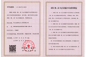 公司資質(zhì)證件齊全。目前擁有電力工程施工總承包叁級資質(zhì)、四級承裝(修、試)電力設(shè)施許可證。